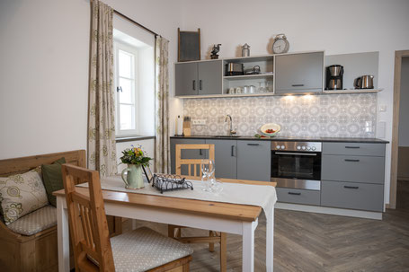 - Wohnküche mit vollausgestatter Küche, Esstisch, Sofa, TV und Radio